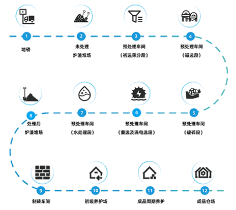炉渣综合利用项目做为垃圾焚烧发电厂的配套项目,其建设的主要目的是有效解决垃圾焚烧发电所产生炉渣的处置问题,保证发电厂的安全、稳定运行。对炉渣进行资源化处理,处理后的炉渣可运用于各类建筑材料生产中,以此达到资源循环利用的目的,杜绝因炉渣填埋处理对土壤、地下水等周边环境造成污染。公司运营、在建的炉渣(建筑垃圾)综合利用项目超30个,固废年处理量超400万吨,项目依托先进的生产监控系统,采用“预处理+制砖”工艺流程,金属回收率超99%,炉渣综合利用率100%。